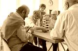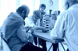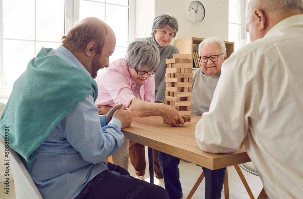 Group of senior people having fun and playing board game in retirement home. Several retired old men and women gather around table and play with wooden tower all together