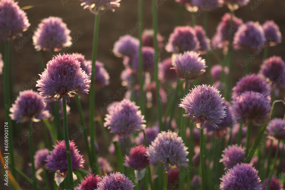 Chives or Allium Schoenoprasum in bloom with purple violet flowers and blossoms against sunlight