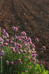 Chives or Allium Schoenoprasum in bloom with purple violet flowers and blossoms against sunlight