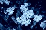 Close-up of Pyracantha or Firethorn bush with many white flowers on branches on early summer