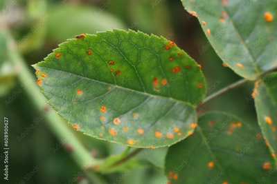 Close-up of bright orange spots on Rose bush leaves in the garden. Rose bush with disease