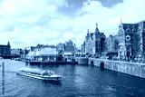Touristic water transportation boat in Amsterdam floating on the surface of Dutch canal. Beautiful Old Town. High quality photo