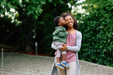 Small black boy kissing his mother outdoors.
