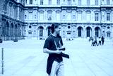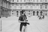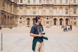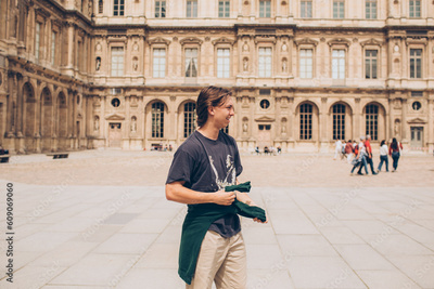 man tying a sweatshirt around his waist as a tourist in paris france europe