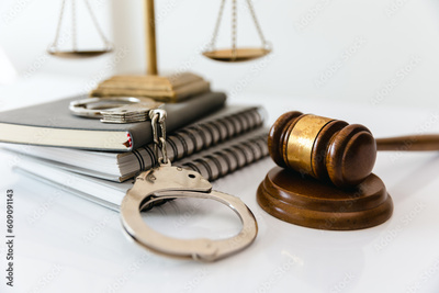 handcuffs and wooden mallet legal lawyer crime and violence concept.