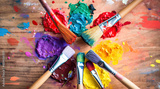 Row of artist paintbrushes closeup on artistic wooden background. Brushes with colorful paints