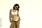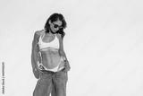 brunette girl in glasses in a white swimsuit and blue jeans against a white wall