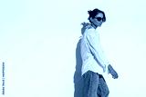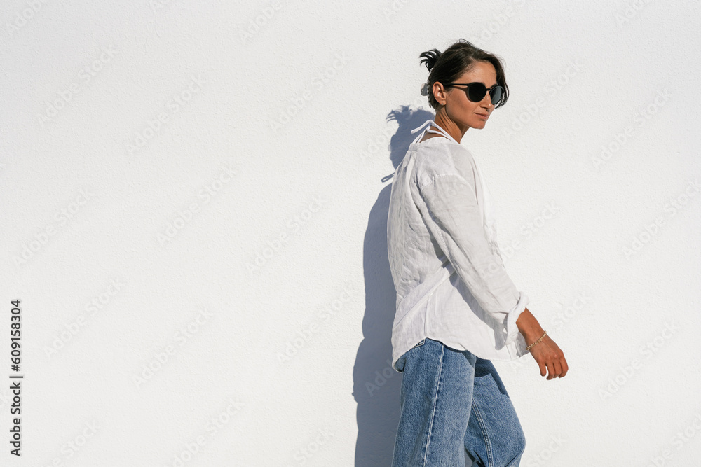 brunette girl in glasses in a white swimsuit and blue jeans against a white wall