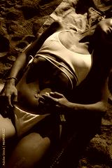 brunette girl with glasses in a white swimsuit lies on the sand on the beach