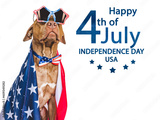 Independence Day. American Flag and cute brown puppy. Closeup, indoors. Studio shot. Congratulations for family, loved ones, friends and colleagues. Pets care concept