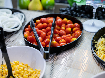 Salad bar. Salad buffet at restaurant. Fresh salad bar buffet for lunch or dinner. Healthy eating. Red tomatoes in bowl on counter. Vegetarian food. Self-service salad station in the restaurant.