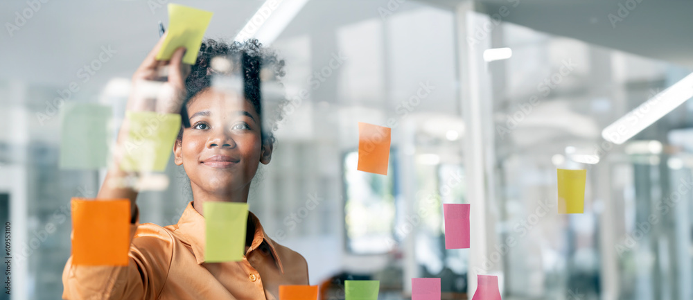 Happy black businesswoman planning new porject with sticky note in a creative office