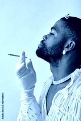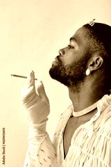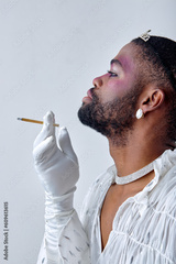 Young adorable black american gay man with make up in stylish shirt smoking cigarette, looking at side isolated on white background studio portrait People lgbt lifestyle, fashion concept