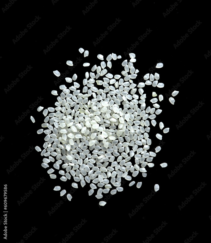 Heaps of uncooked Japanese short grain rice piled together isolated on black background.