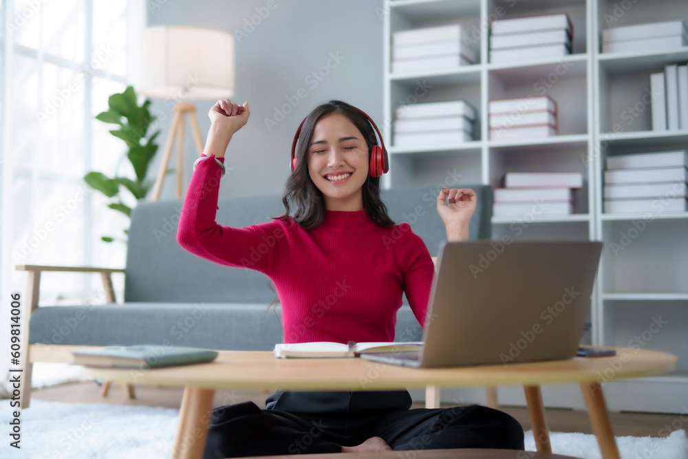 Cute Asian young woman red shirt is using laptop computer sitting on the floor in the living room, watching movie, listening to music, shopping online, watching live broadcast.
