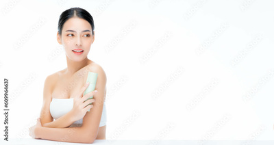 Beauty asian woman model hold cosmetic bottle with smiling Beautiful Asian female showing skincare bottle product Cosmetic Cosmetology concept isolated on white background copy space for advertising