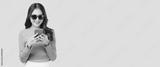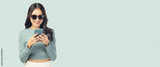 Happy and excited young woman using mobile phone standing over isolated on green background and copy space Young girl using smartphone for shopping online chat and texting message She get surprised