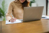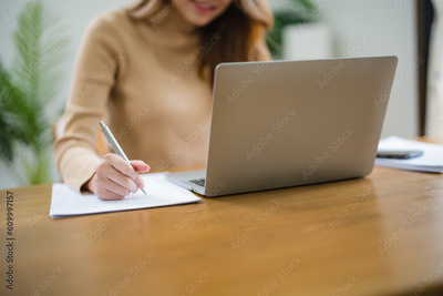 Business Professional Accountant Woman working on laptop computer making research for planning startup at desktop working process in office
