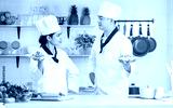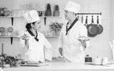 Two Asian male and female professional chef wearing uniform, holding plate, presenting of cooking competition, looking each other, standing in kitchen.