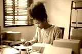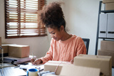 Startup young african american entrepreneur preparing cardboard box for ship to customer.