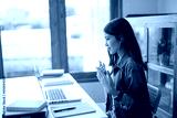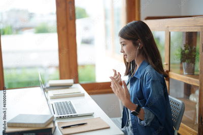 Happy asian woman speak conference on laptop in video call people smart working from home.