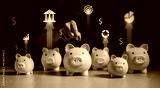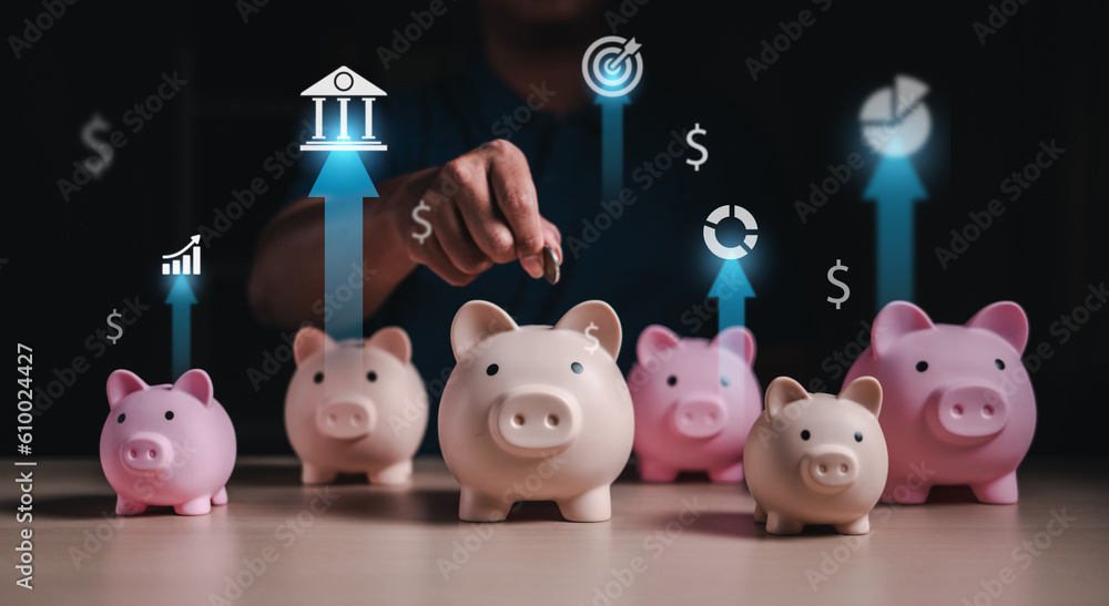 piggy bank, financial, banking, finance, investment, currency, profit, money, wealth, asset. insert coin into piggy bank and investment hud is showing. financial and banking invest for change to asset