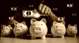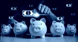 piggybank, financial, banking, finance, investment, currency, profit, money, wealth, banknote. insert coin into piggybank to saving after that banknote hud is growth. wealth finance investment profit.