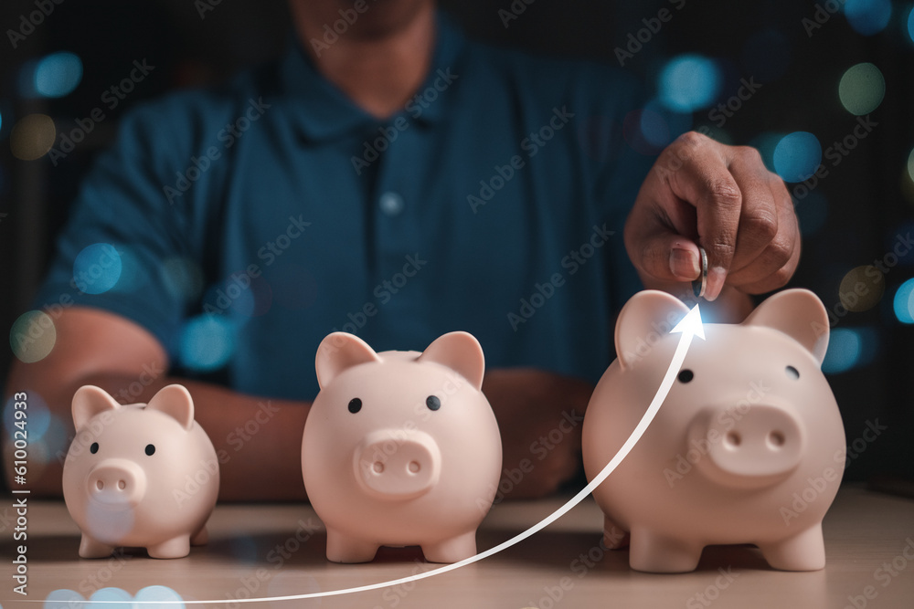 piggy bank, financial, banking, finance, investment, profit, money, wealth, asset, growth. insert a coin into piggy bank and line of profit is growth up for take benefit. investment financial wealth.