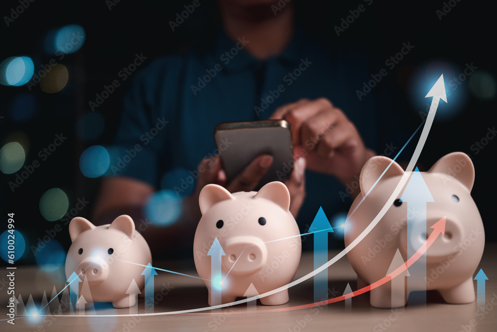 piggy bank, financial, banking, finance, investment, profit, money, wealth, asset, grow. touching at smart phone for checking and take profit from mine position on investment. financial finance asset.