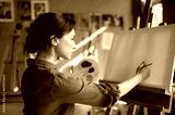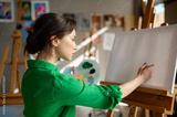 Young woman starting to draw on blank empty canvas with oil paints in art studio