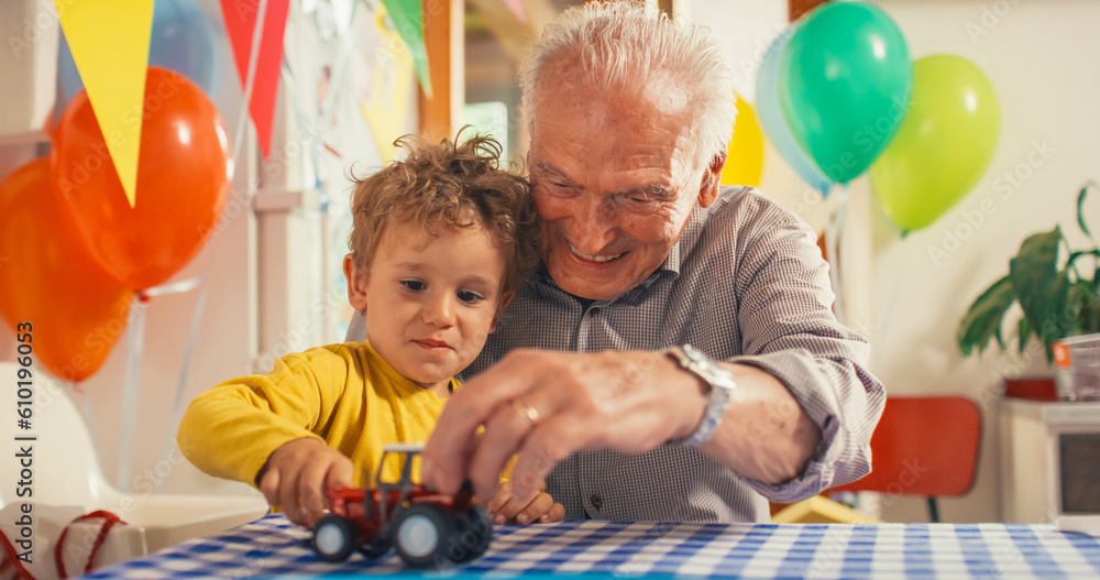 Heartwarming Moment Shared Between a Senior Man and his Grandson: Happy Toddler and his Grandpa Playing with Truck and Plane Toys Together in a Kitchen Decorated with Balloons for a Birthday Party