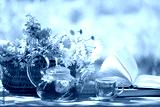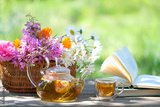 glass teapot and cup with herbal tea, flowers in basket, book close up on table, natural abstract background. Beautiful rustic composition. relax time. useful calming tea. Tea party in garden