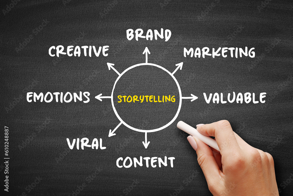 Storytelling mind map process on blackboard, concept for presentations and reports
