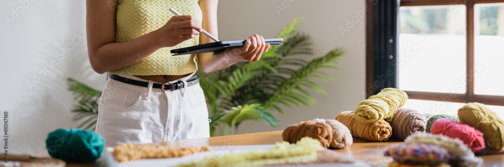 Punch needle, Young asian woman Embroidery a home decoration by handmade, hobby leisure.