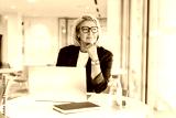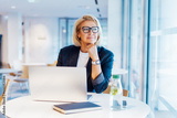 50's confident mature businesswoman dreamy looking at window, middle-aged experienced senior female professional working on laptop in open space office. Female entrepreneur working remotely.