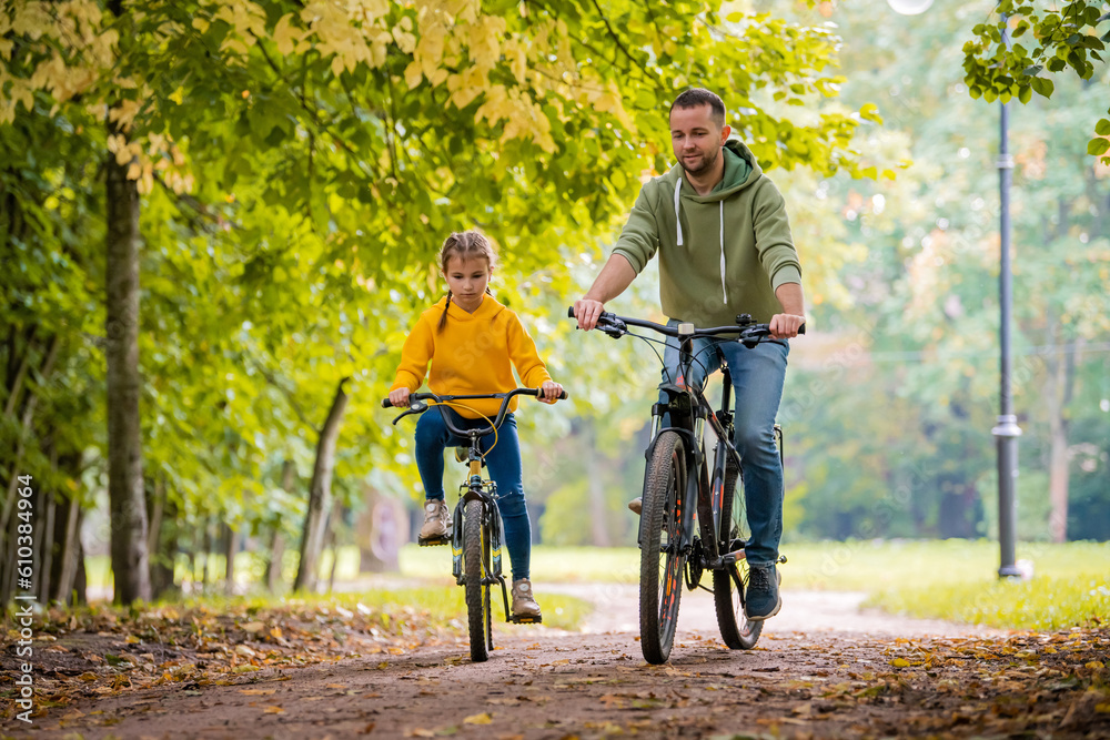 Happy father and daughter ride bicycles in autumn park on sunny day.