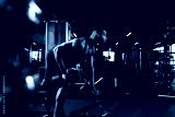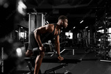 athletic african american man trains in dark gym, athletic guy lifts heavy dumbbells in fitness club
