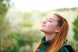 Smiley redhead young woman breathing fresh air standing outdoors.