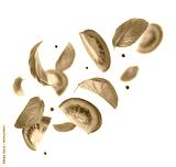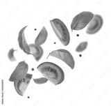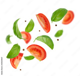 Flying ingredients of tomatoes, basil, pepper on white background. Italian food