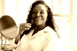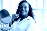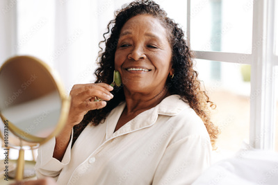 Woman using a jade stone for a facial massage at home