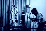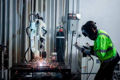 Engineer factory industry wearing safety uniform work and checking system of the welding robots for welding steel electrical by control system robot automate for industry manufacture concept.