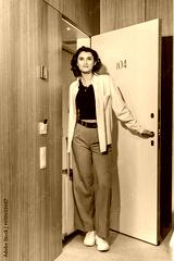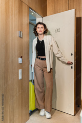 full length of pleased woman in white shirt and beige pants, with wavy brunette hair holding yellow travel bag and smiling while opening door of hotel suite near keycard reader, check-in