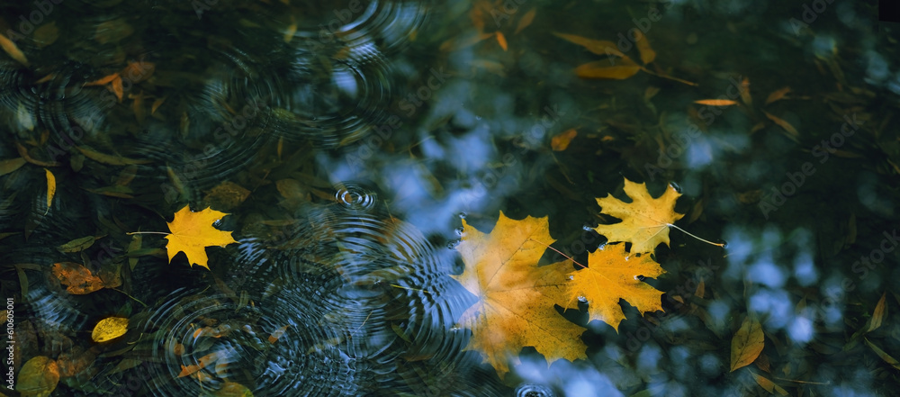 Autumn background. yellow maple leaves in dark water, abstract natural backdrop. rainy day. autumn season. atmosphere image. symbol of fall time. top view. copy space. template for design. banner