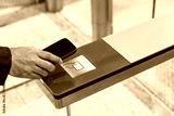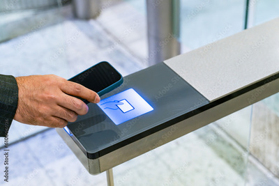 スマホをタッチしてエントランスゲートを通るビジネスパーソン