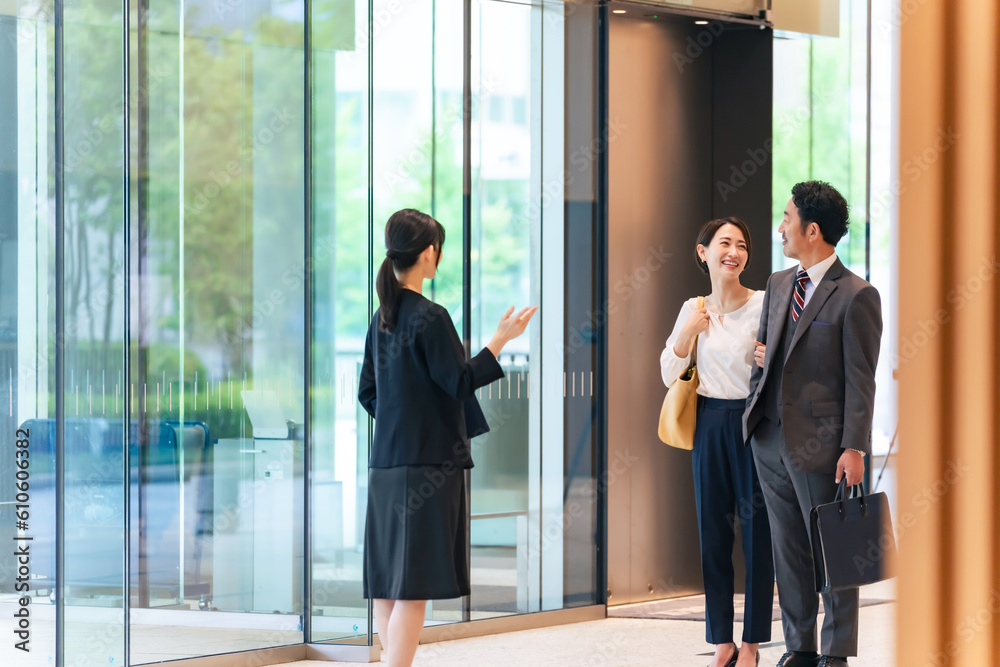 カップルを案内する女性案内員