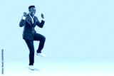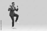 Happy confident attractive African American man in cool modern trendy red suit celebrating victory, feeling overjoyed and super excited, fist pumping and having fun on light blue copyspace background
