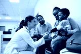 Female pediatrician talks to black little boy who is sitting on mother's lap at clinic.