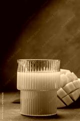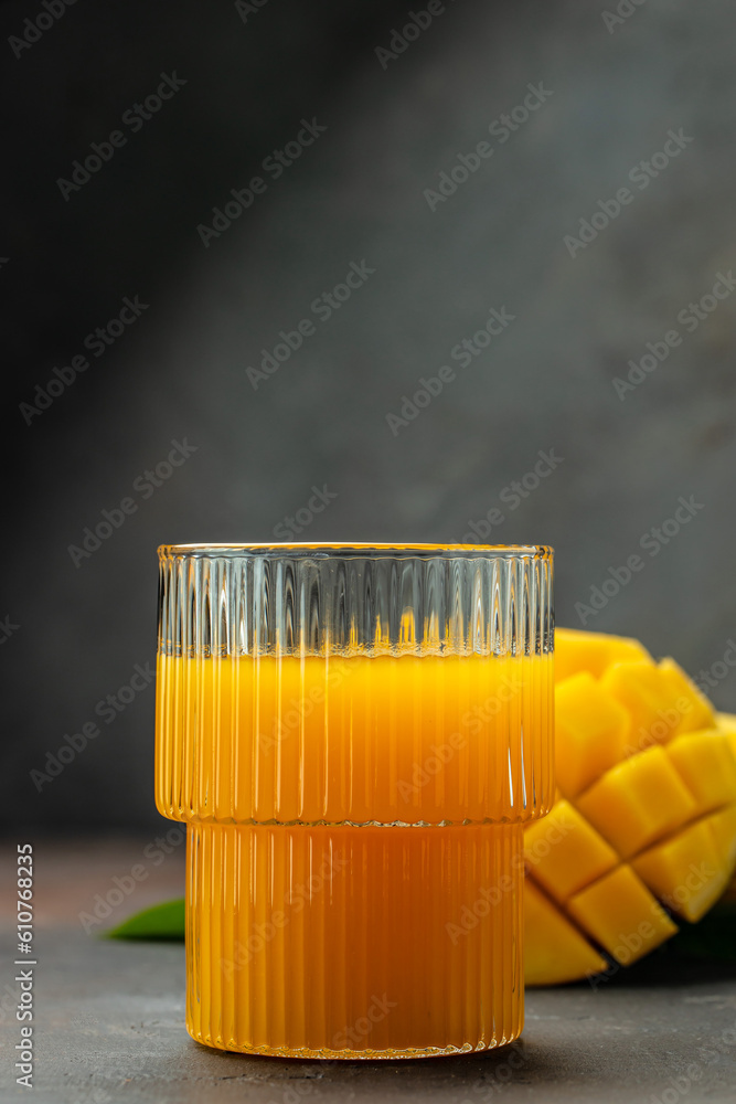mango juice with Fresh tropical fruit on a dark background. vertical image. place for text