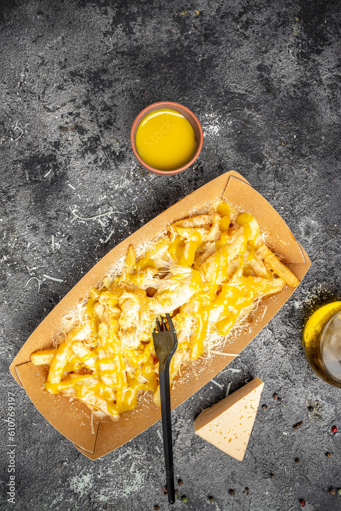 Cheddar Cheese Poured or Pulled from on top Deep Fried French Fries on a dark background, Fast food take away. copy space