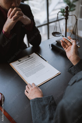 Young businessman concentrating on signing a contract with a skilled female lawyer and financial adviser explaining in detail legal information for signing a contract at a meeting in an office.